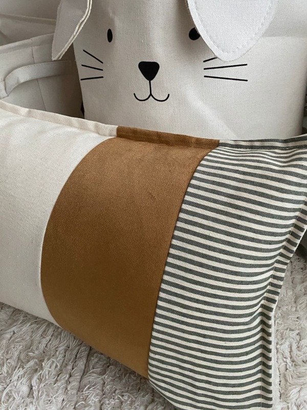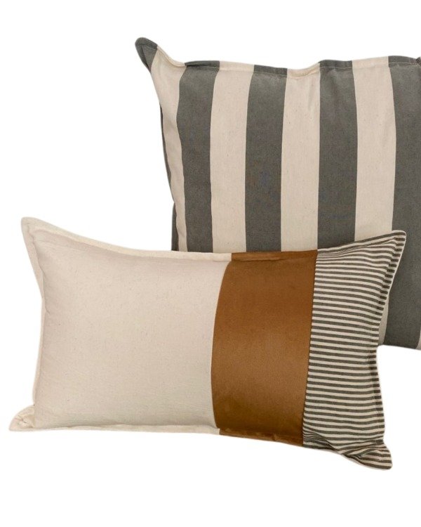 Almohadón de tusor panamá color natural, combinado con pana suela y mil rayas verde seco.